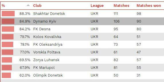 Второе место заняло Динамо: в 106 матчах киевляне открывали счет в игре, из которых 90 игр оказались победными (84,9%).