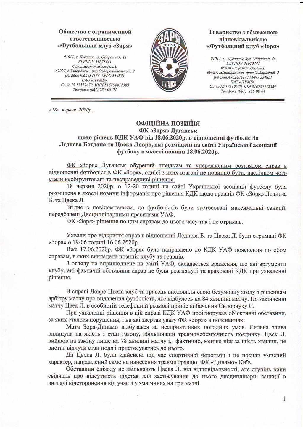 Заря на своем официальном сайте опубликовала реакцию на решения Контрольно-дисциплинарного комитета Украинской ассоциации футбола о дисквалификации полузащитников Богдана Леднева и Ловро Цвека на один и три поединка соответственно.
