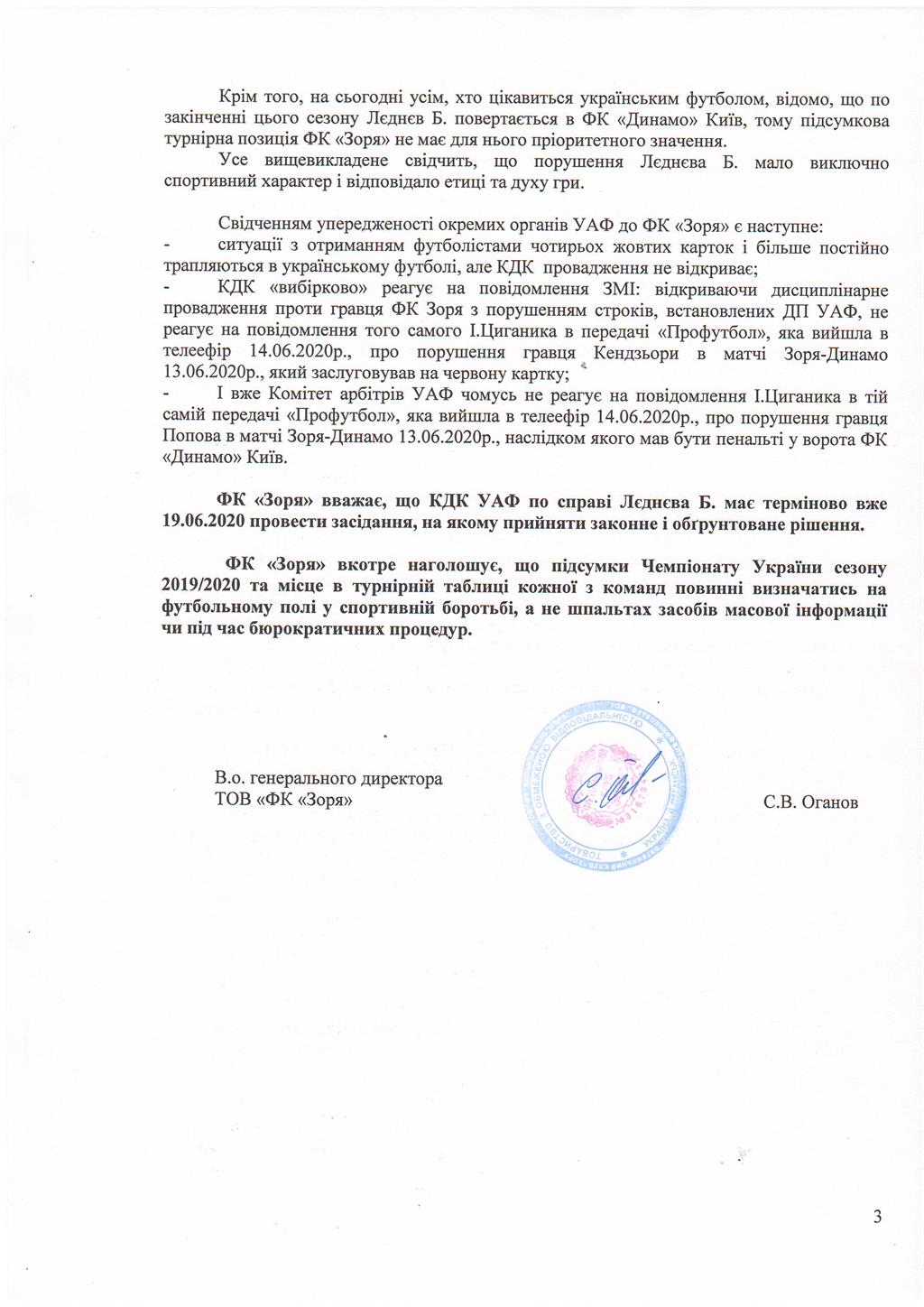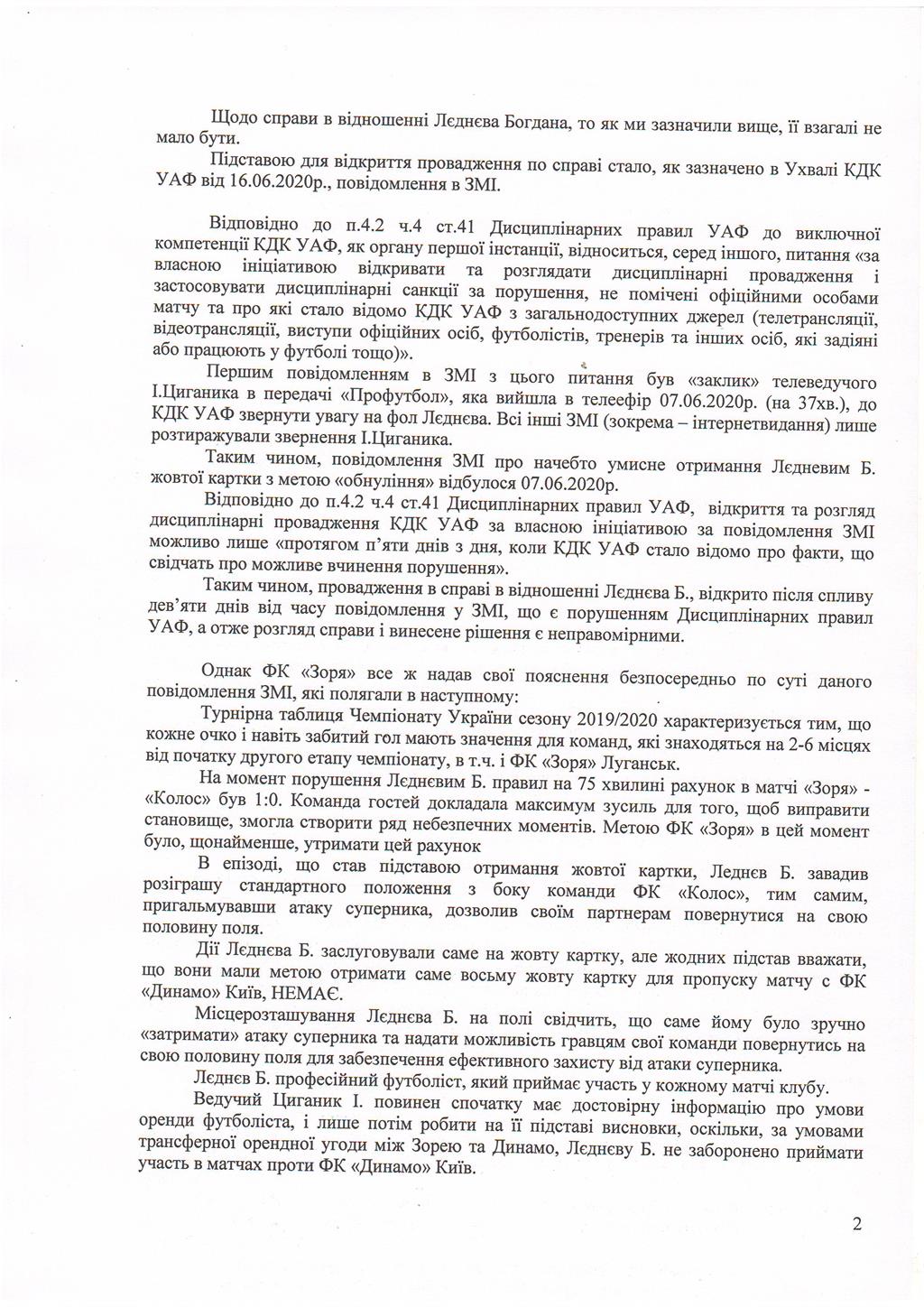 В луганском клубе категорически не согласились с наказаниями КДК. В ситуации с Цвеком, который грубо сфолил на капитане Динамо Сергее Сидорчуке, Заря сослалась на плохие погодные условия и исключает вариант с умышленным нанесением повреждения. Что касается Леднева, то утверждается, что его нарушение имело только спортивный характер.