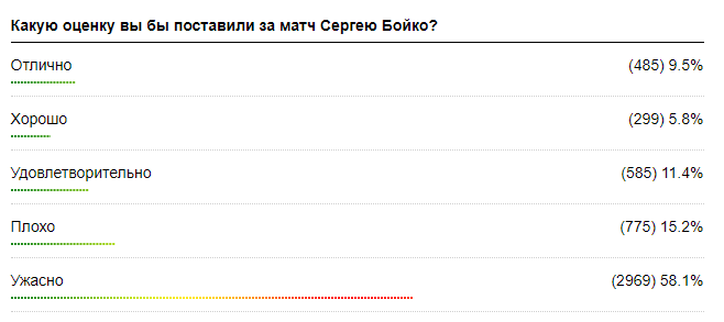 После матча хавбек Колоса Вадим Милько заявил, что "это превращается в цирк". Пользователи Football.ua согласны с игроком. 58,1% юзеров (2969 человек) назвали судейство Сергея Бойко "ужасным", 9,5% (485 голосов) – "отличным". Остальные 32,4% голосов разделились между вариантами "хорошо", "удовлетворительно" и "плохо".