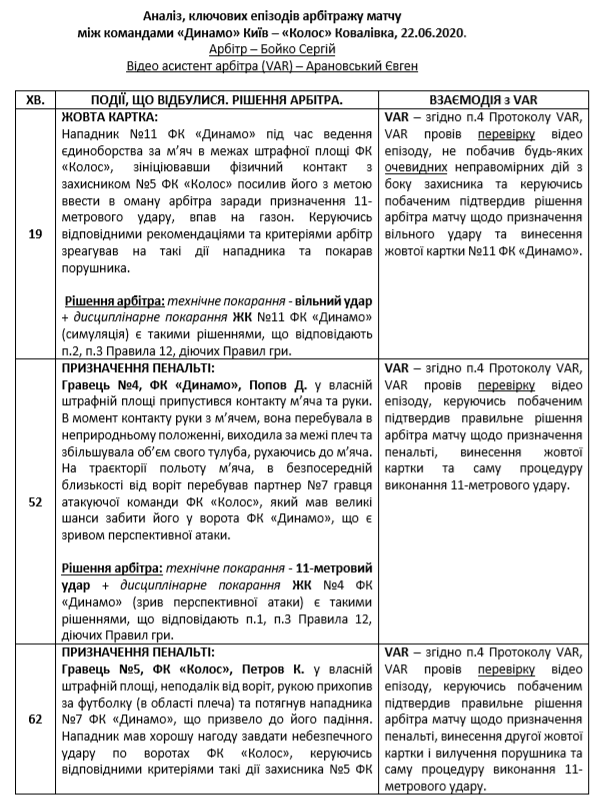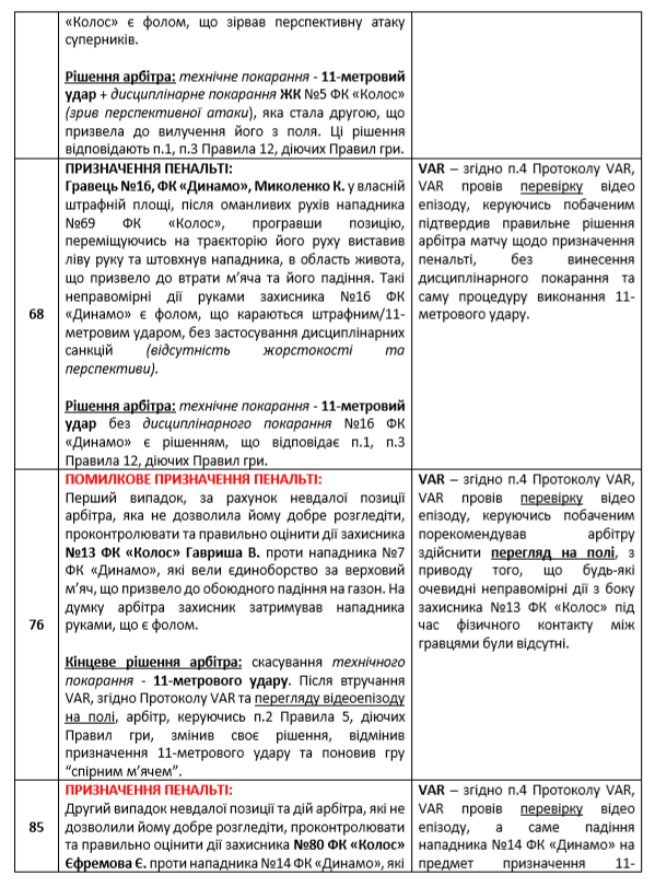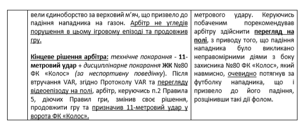 Также комитет выделил момент, когда арбитр позволил продолжить игру после падения Де Пены, но после просмотра повтора указал на "точку", что по мнению Комитета арбитров УАФ - верное решение.