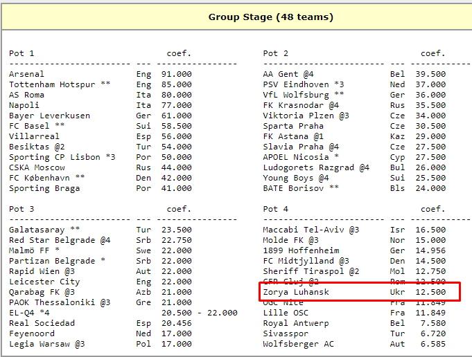 Отталкиваясь от коэффициента команды, 12,5, луганчане могут рассчитывать на третью корзину при жеребьевке. Есть минимальный шанс оказаться во второй корзине, но это что-то на грани фантастики. Также есть небольшая вероятность оказаться в четвертой корзине.