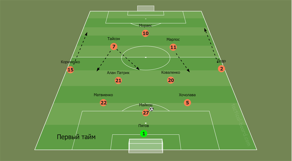 В перерыве Каштру снимает Патрика и выпускает Степаненко, а Майкон теперь не садится к центральным защитникам и выполняет скорее роль "восьмерки". Соответственно, Коваленко располагается ближе к форварду.