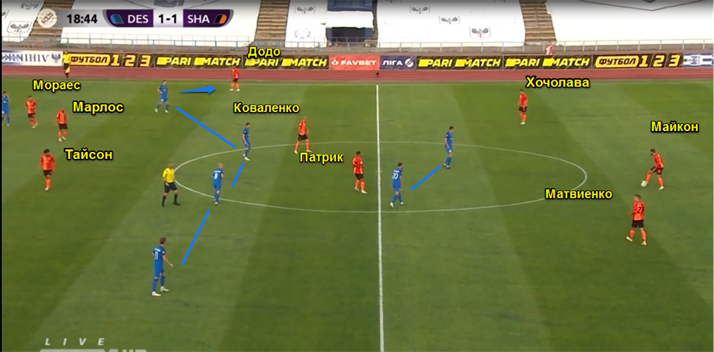 Эти сочетания актуальны в контексте лишь первого тайма. В чем, собственно, проблема? Из-за того, что центральные защитники не самостоятельные в плане продвижения мяча, на помощь им приходит Майкон. Таким образом, ниже опускается Коваленко — Шахтер теряет одного футболиста, который мог бы располагаться между линиями ближе к штрафной соперника. Если еще учесть, что и Тайсон и Марлос регулярно "шли на глубину" в поисках мяча, то перед защитниками Десны регулярно мелькал один Мораес и крайние латерали — Корниенко и Додо. Правда, с крайними защитниками Шахтера регулярно отрабатывали Калитвинцев и Гуцуляк — соответственно. Поэтому, могло показаться, что Десна иногда играет в шесть защитников.