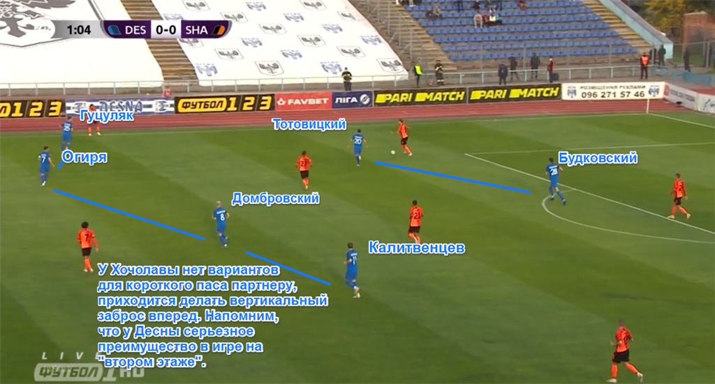 Десна выстраивалась в 4-4-2, где Тотовицкий и Будковский перекрывали пути для передач. Учитывая, что в первом тайме Майкон садился ниже, то в центре получалась ситуация 2в2 — Огиря и Домбровский против Патрика и Коваленко. Крайние полузащитники Десны отвечали за крайних защитников Шахтера.
