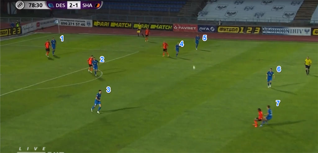 Единственное, что Мостовой на мгновение нарушил цепочку из шести обороняющихся игроков. Также обратите внимание, что у Шахтера нет пространства вообще.
