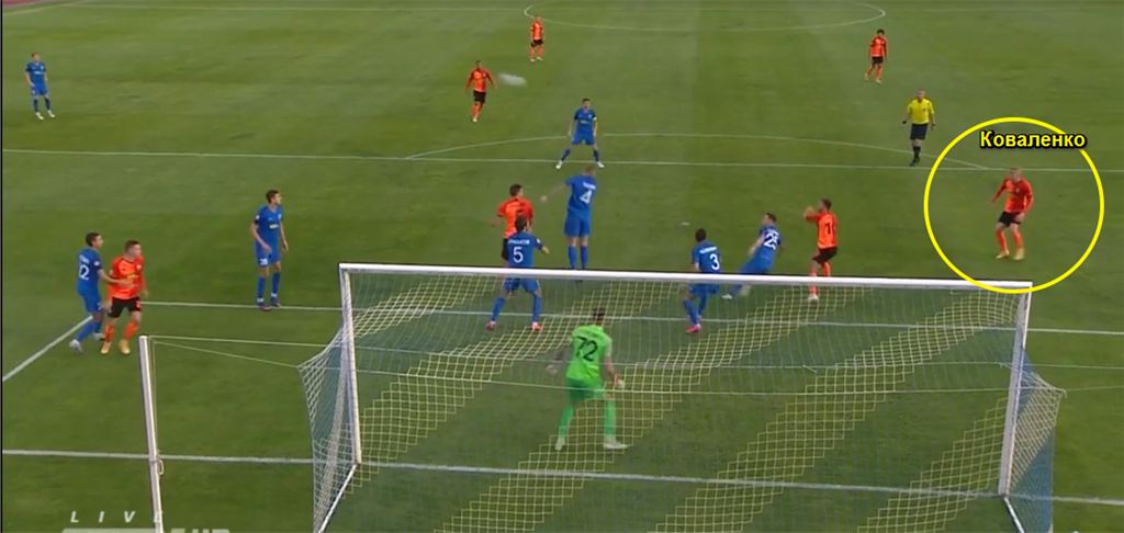 Видим, что Десна при этом стандарте играет с "зонной" опекой: шесть защитников с ружьями стерегут клочок поля у своих ворот. Игроков Шахтера на два меньше. В момент подачи все шестеро ориентированы на мяч и не видят расположения "горняков". В итоге, Коваленко отклеился от своих трех партнеров, которые побежали бороться вверху и добил мяч в сетку, будучи совершенно свободным.
