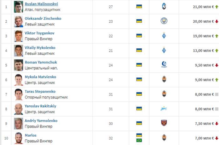 Также в топ-10 самых дорогих футболистов с украинским паспортом вошли Виталий Миколенко (Динамо), Роман Яремчук (Гент), Николай Матвиенко (Шахтер), Тарас Степаненко (Шахтер), Ярослав Ракицкий (Зенит), Андрей Ярмоленко (Вест Хэм) и Марлос (Шахтер).