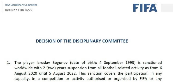 Окончательный вердикт FIFA оказался достаточно строгим для украинского полузащитника Ярослава Богунова.