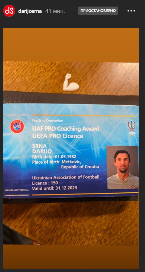 Как сообщил с помощью своего Instagram-аккаунта экс-игрок донецкого Шахтера Дарио Срна, ему удалось успешно завершить обучение в подготовке к работе на посту главного тренера, свидетельством чему стала полученная тренерская лицензия категории "PRO" от УЕФА.