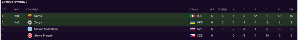 Заря в Лиге Европы попала в группу со Славией, Слованом и Ромой. Команде Скрипника удалось занять второе место в группе и выйти в следующий этап.