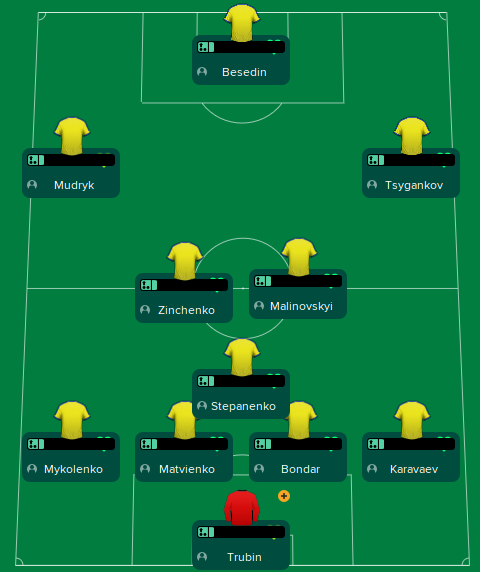 Резник (Сент-Этьен), Бурда (Вулверхэмптон), Коваленко (Динамо), Яремчук (Аль Наср), Шапаренко (Трабзонспор), Корниенко (Ювентус), Петряк (Астон Вилла), Русин (Фортуна), Болбат (Шахтер), Валерий Бондаренко (Шахтер), Никита Шевченко (Сент-Этьен), Шепелев (Вест Хэм).