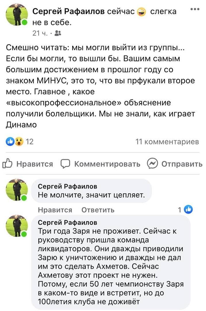 Смешно читать: мы могли выйти из группы в Лиге Европы. Если бы могли, то вышли. Вашим самым большим достижением в прошлом году со знаком минус было то, что вы "профукали" второе место. Главное, какое "высокопрофессиональное" объяснение получили болельщики. Мы не знали, как играет Динамо", — написал Рафаилов в Facebook.