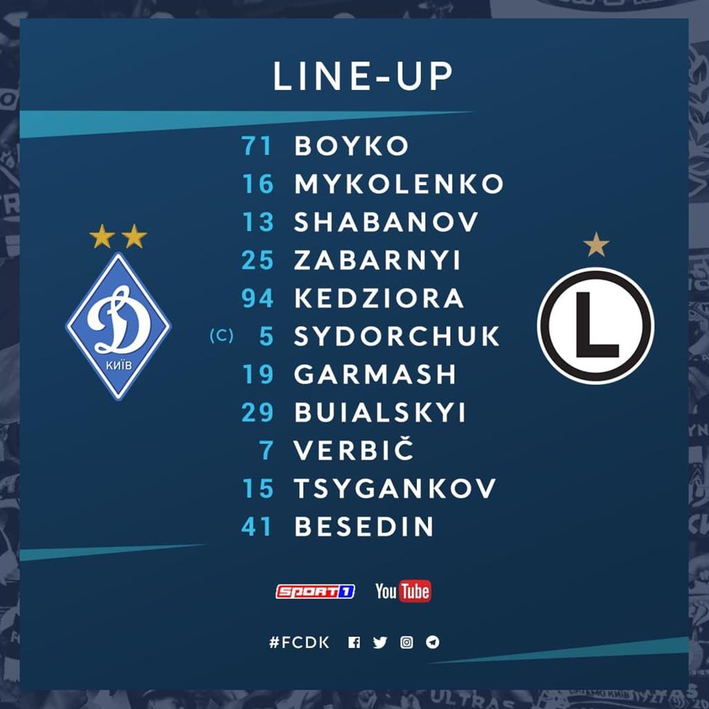 Стартовый состав Динамо выглядит следующим образом: Бойко — Кендзера, Шабанов, Забарный, Миколенко — Сидорчук, Гармаш — Цыганков, Буяльский, Вербич — Беседин.