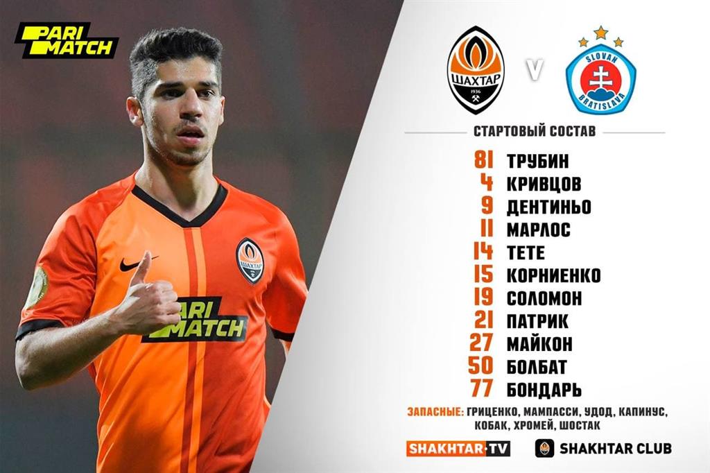 Шахтёр: Трубин — Болбат, Кривцов, Бондарь, Корниенко — Майкон — Тете, Дентиньо, Алан Патрик, Марлос — Соломон.
