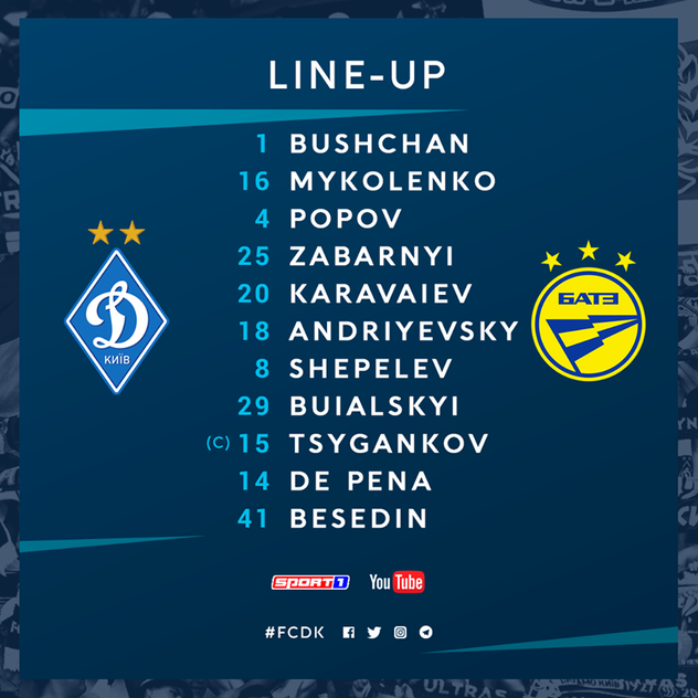 Динамо Киев: Бущан — Караваев, Забарный, Попов, Миколенко — Андриевский, Шепелев — Цыганков, Буяльский, де Пена — Беседин.