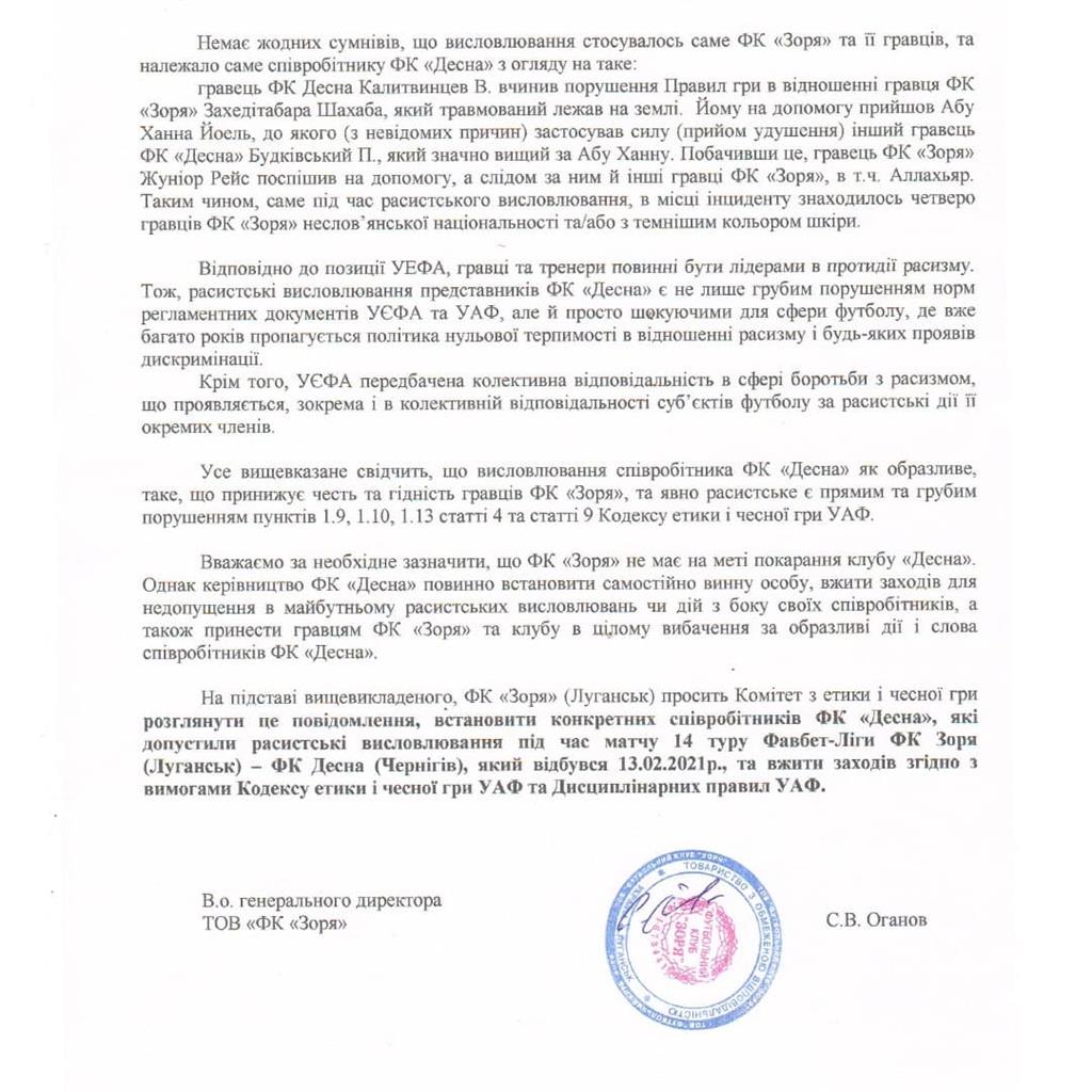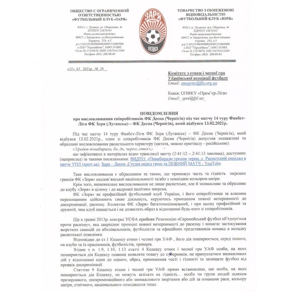Заря обратилась в Комитет УАФ по этике и честной игре с требованием разобраться с расистским инцидентом, произошедшим во время матча 14-го тура чемпионата Украины против Десны — сообщил официальный сайт луганского клуба.