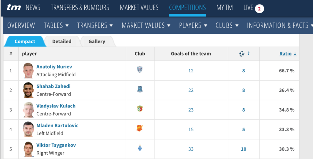 Нападающий Миная Анатолий Нуриев забил 8 голов в текущем сезоне УПЛ. Таким образом, по информации Transfermarkt, на счет форварда 66% голов клуба.