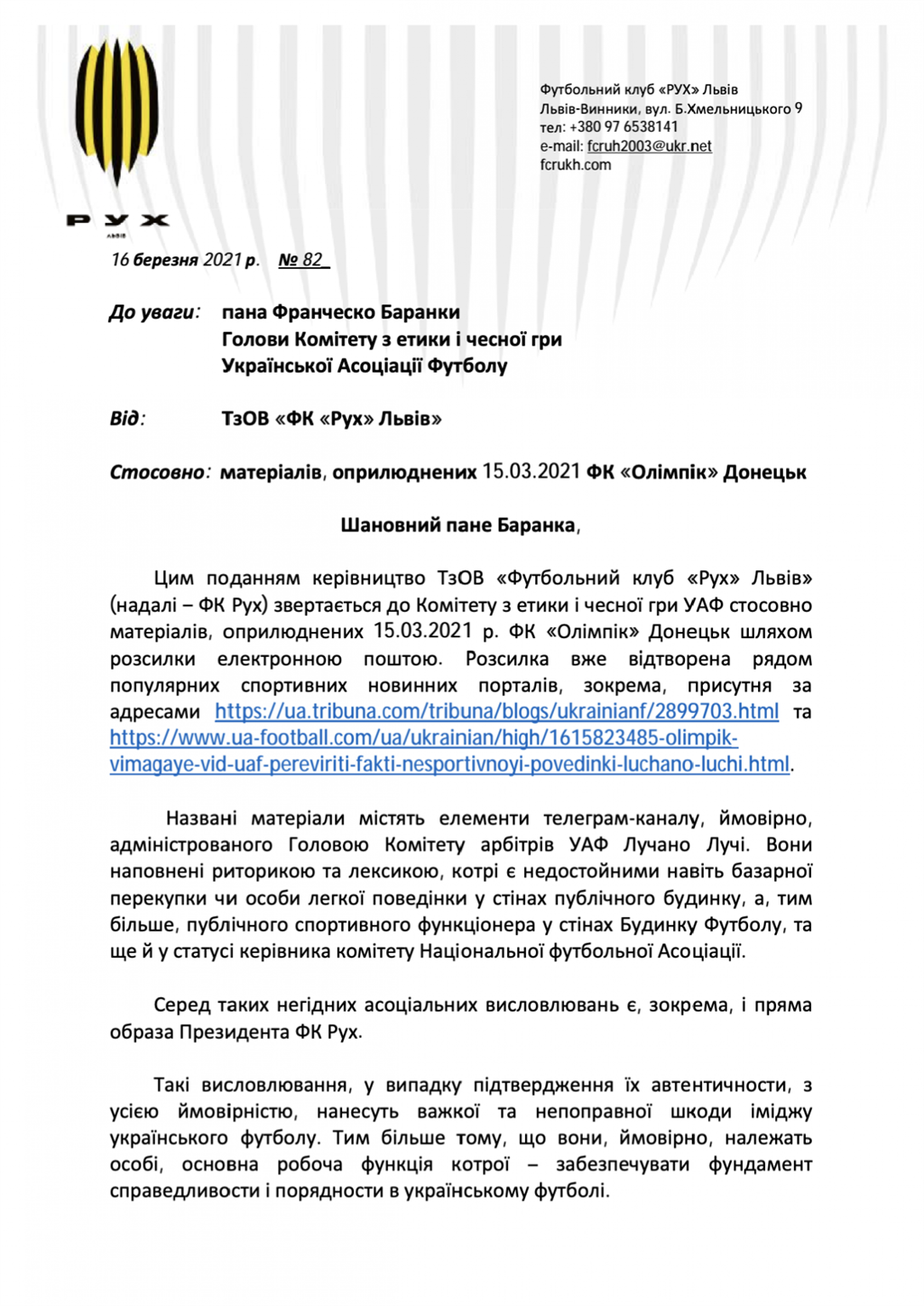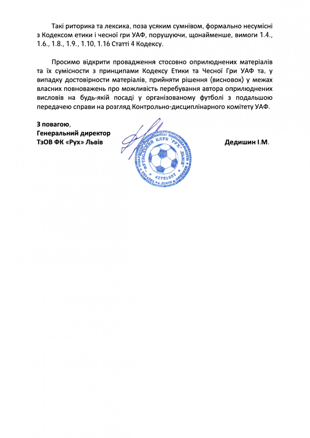 Рух следом за Олимпиком обратился в Комитет по этике и честной игры по поводу оскорбительных высказываний Председателя Комитета арбитров УАФ Лучано Лучи, в том числе и в адрес президента "желто-черных" Григория Козловского.