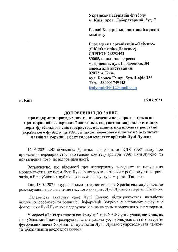 В понедельник, 15 марта, Олимпик уже обращался в КДК УАФ, однако в связи с появлением новых доказательств неспортивного поведения Лучи, повторно потребовал провести справедливое и открытое расследование.