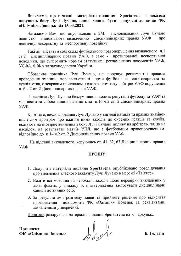 Олимпик продолжает требовать проведения расследования в отношении главы судейского комитета УАФ Лучано Лучи — сообщает официальный сайт клуба.