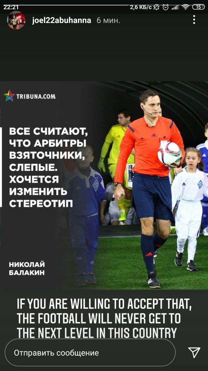 После игры защитник Зари Жоэль Абу Ханна в своем Instagram-аккаунте опубликовал цитату Балакина: "Все считают, что арбитры взяточники, слепые. Хочется изменить стереотип".