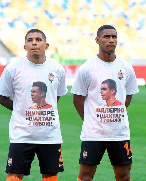 Перед началом встречи футболисты Шахтера поддержали своих партнеров — Валерия Бондаря и Жуниора Мораеса, которые выбыли из-за серьезных травм.