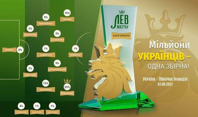По итогам голосования приз "Лев матчу" в игре против Северной Ирландии получил Андрей Ярмоленко. Возвращение правого вингера в основной состав национальной команды было отдельным сюжетом в общем сценарии отчетного поединка.