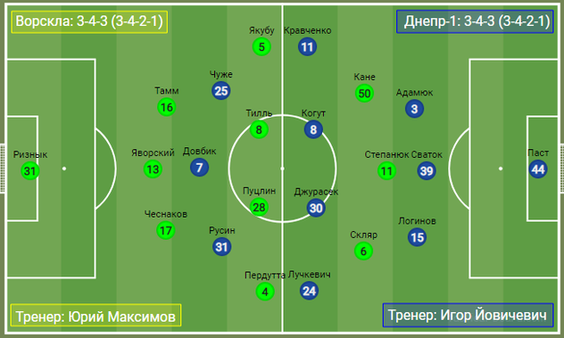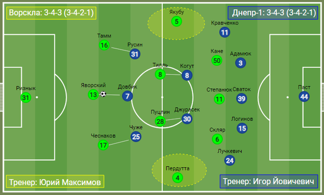 В равных составах у гостей была интересная структура прессинга, но высокие позиции тройки нападающих Ворсклы заставляли латералей Днепра-1 садиться в линию обороны. При этом часто свободными оставались их коллеги из Ворсклы — Якубу и Пердута. Именно через них старались развивать атаки хозяева поля, когда сталкивались с давлением соперника на своей половине поля.