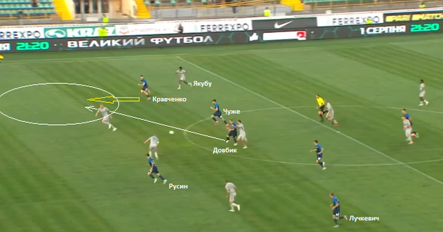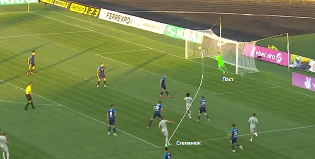 На скриншоте выше — эпизод с выходом в самую опасную атаку гостей в первом тайме. Довбик быстро отдал на ход Кравченко в полуфланг, тот прострелил в штрафную и тот же Добвик завершал эпизод. Нападающий Днепра-1 не сумел переиграть Ризныка, который уже давно громко стучится в сборную.