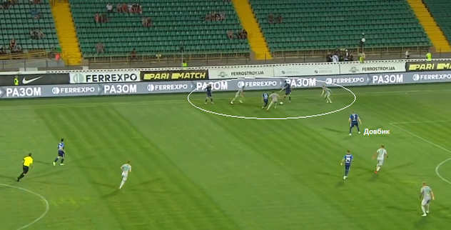 Это тот самый момент с прессингом гостей на фланге, который привел к первому голу Довбика. Удивительно, что команда, которая две с половиной минуты назад осталась в меньшинстве, так высоко и смело прессинговала. Но, еще удивительнее то, как безалаберно действовала Ворскла. На фланге, в своей трети поля они допускают соотношение сил 3 в 3. При этом, самый опасный в составе команды соперника футболист — совершенно свободный. То есть, играя в большинстве, Ворскла допускает численный перевес соперника на своей трети поля. Практически в зоне мяча.