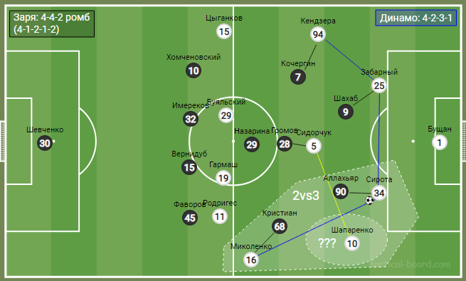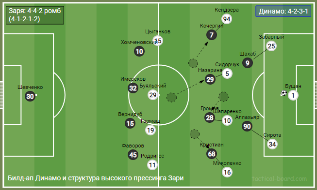 Помимо структуры высокого прессинга у Зари следует отметить и систему позиционной игры в атаке. Она была традиционной для команды Скрипника. Небольшое количество голевых моментов у ворот соперника – повод отметить игру в обороне Динамо. Киевляне также активно задействовали прессинг, но не на такой регулярной основе. При переходе в позиционную оборону команда Луческу перестраивалась на структуру 4-4-2 с Гармашем и Буяльским впереди.