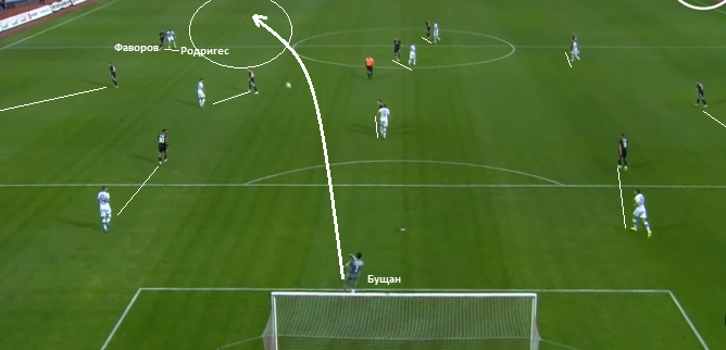 Проактивные методы хозяев поля несколько затрудняли продвижение мяча во вторую треть поля. Постепенно, киевляне начали отказываться от розыгрыша и Бущан вводил мяч в игру прямым ударом. На скриншоте выше – пример одного из таких прямых ударов, который едва не привел к голевому моменту у ворот Шевченко. Как видим, хозяева держали оппонентов один в один, но вратарь Динамо исполнил точный заброс на ход Родригесу, который в этот момент едва не воспользовался временной позиционной ошибкой державшего его Фаворова.