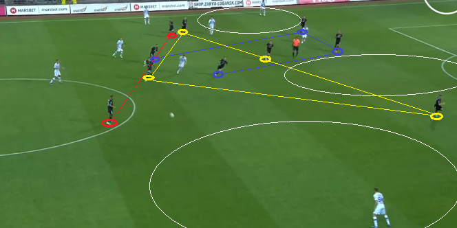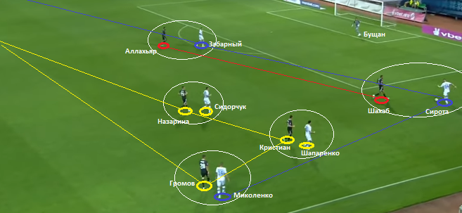 Еще весной, в концовке прошлого сезона, Динамо заметно стало прибавлять в игре под давлением. Видно, как команда Луческу прогрессирует в этом аспекте. Одним из главных приемов Киева при выходе из под высокого прессинга были смещения Миколенко и Шапаренко. Первый поднимался вверх по флангу, а второй опускался в его зону. В динамике это создавало гостям время и пространство для продвижения мяча во вторую фазу позиционной атаки. На схеме видно, как Динамо создавало численный перевес в зоне взаимодействий – трое против двух. Часто Шапаренко оставался свободным. Кристиан должен был уходить вместе с Миколенко, а Аллахьяр разрывался между своим игроком и Шапаренко.