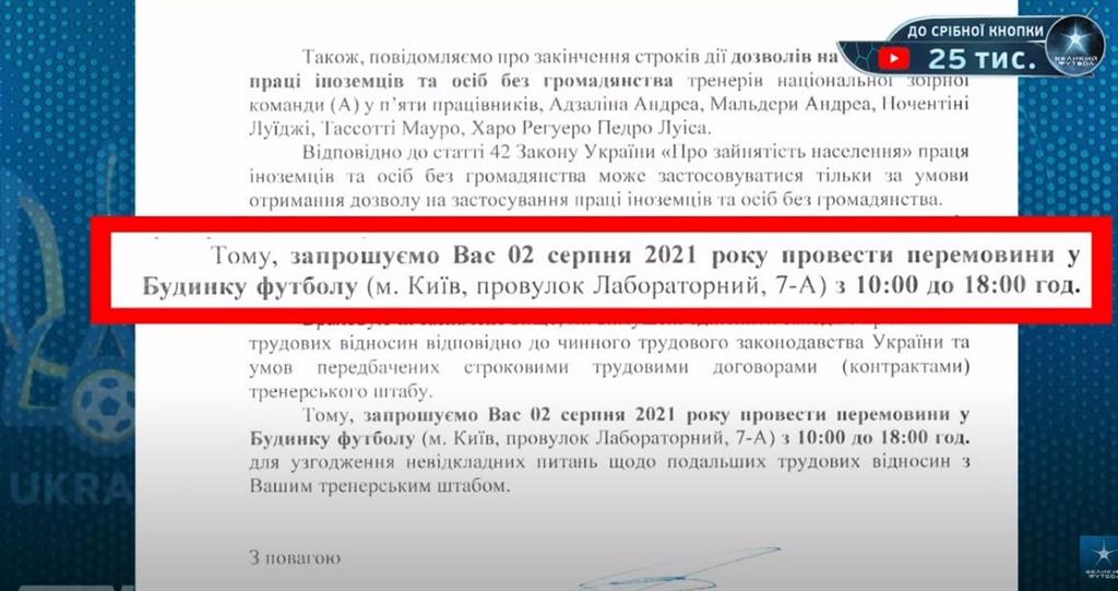 УАФ отправляла письмо бывшему главному тренеру сборной Украины Андрею Шевченко о встрече, которая была запланирована на 2 августа, с целью переговоров о продлении контракта.