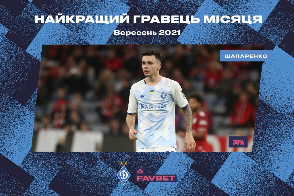 По итогам голосования среди болельщиков киевского Динамо полузащитник Николай Шапаренко стал лучшим игроком сентября.