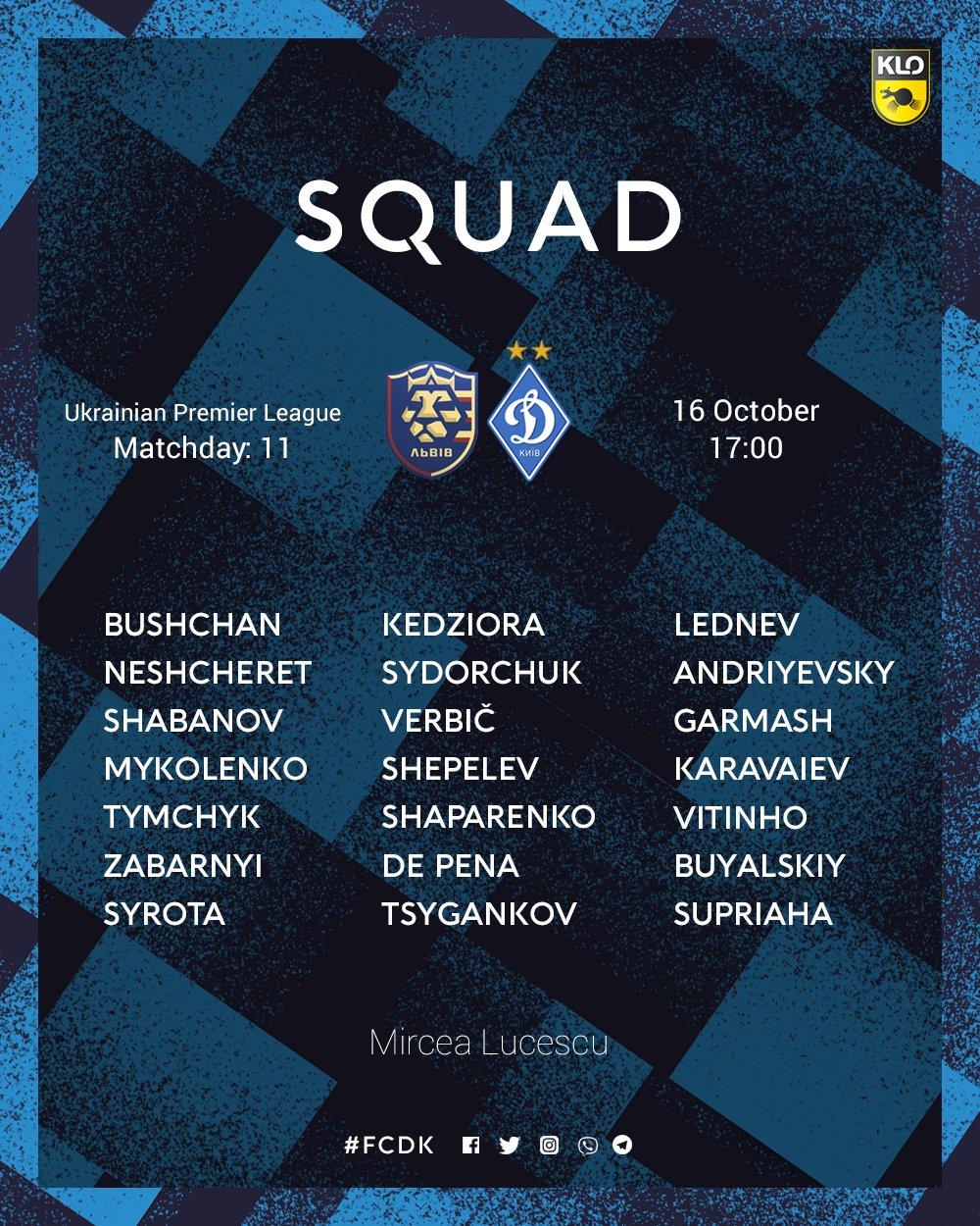Тренерский штаб столичного клуба определился с футболистами, которые могут принять участие в будущем поединке. Мирча Луческу взял с собой 21 футболиста, где нашлось место всего одному форварду — Владиславу Супряге.