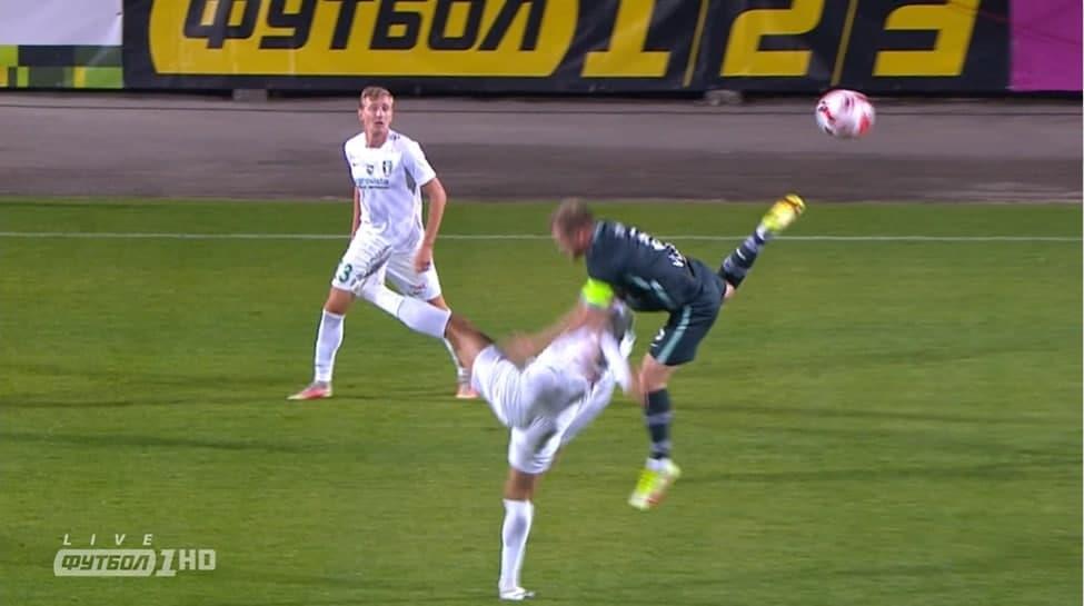 Полузащитник александрийцев Кирилл Ковалец в первой половине игры неудачного приземлился после верхового единоборства.