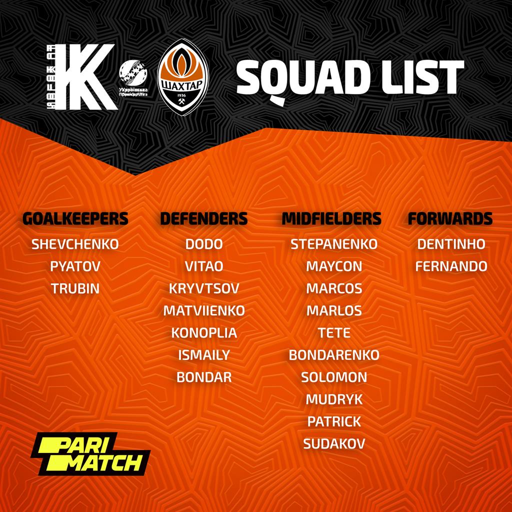 В список донецкой команды вошли 22 футболиста, среди которых не нашлось места для двух защитников — Марлона и Виктора Корниенко, а также нападающего Даниила Сикана.