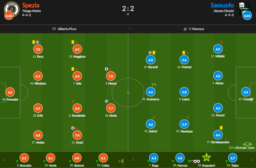 Специя в рамках поединка шестнадцатого тура чемпионата Италии сыграла вничью с Сассуоло в домашних стенах (2:2).