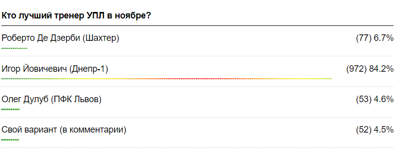 Многие тренеры сумели проявить себя с лучшей стороны, однако мы выделили троих: Роберто Де Дзерби (Шахтер), Игор Йовичевич (Днепр-1), Олег Дулуб (ПФК Львов). Среди этих специалистов мы и предложили выбрать нашим читателям лучшего.