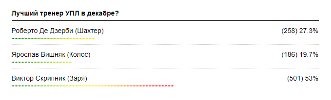 За Виктора Скрипника проголосовали больше половины читателей – 53% (501 голос). На втором месте главный тренер Шахтера Роберто Де Дзерби – 258 голосов. За Ярослава Вишняка из Колоса проголосовало 186 человек.