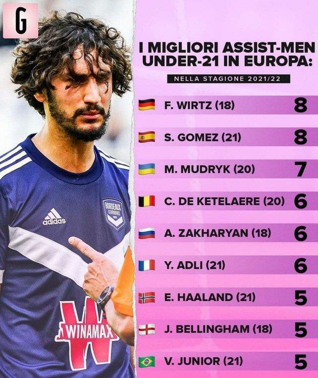 Итальянская газета La Gazzetta dello Sport составила рейтинг лучших игроков до 21 года по количеству результативных передач в нынешнем сезоне.