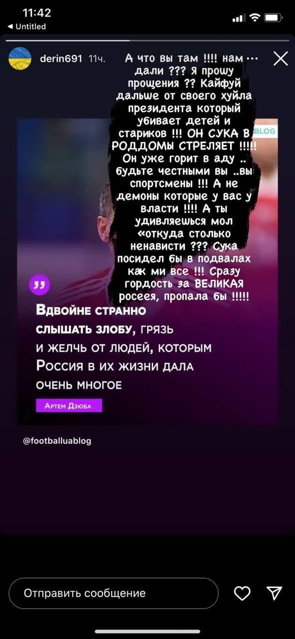 А ты удивляешься мол "откуда столько ненависти"??? С*ка, посидел бы в подвалах, как мы все!!! Сразу гордость за "великую россею" пропала бы!!!", — залишив допис український гравець.