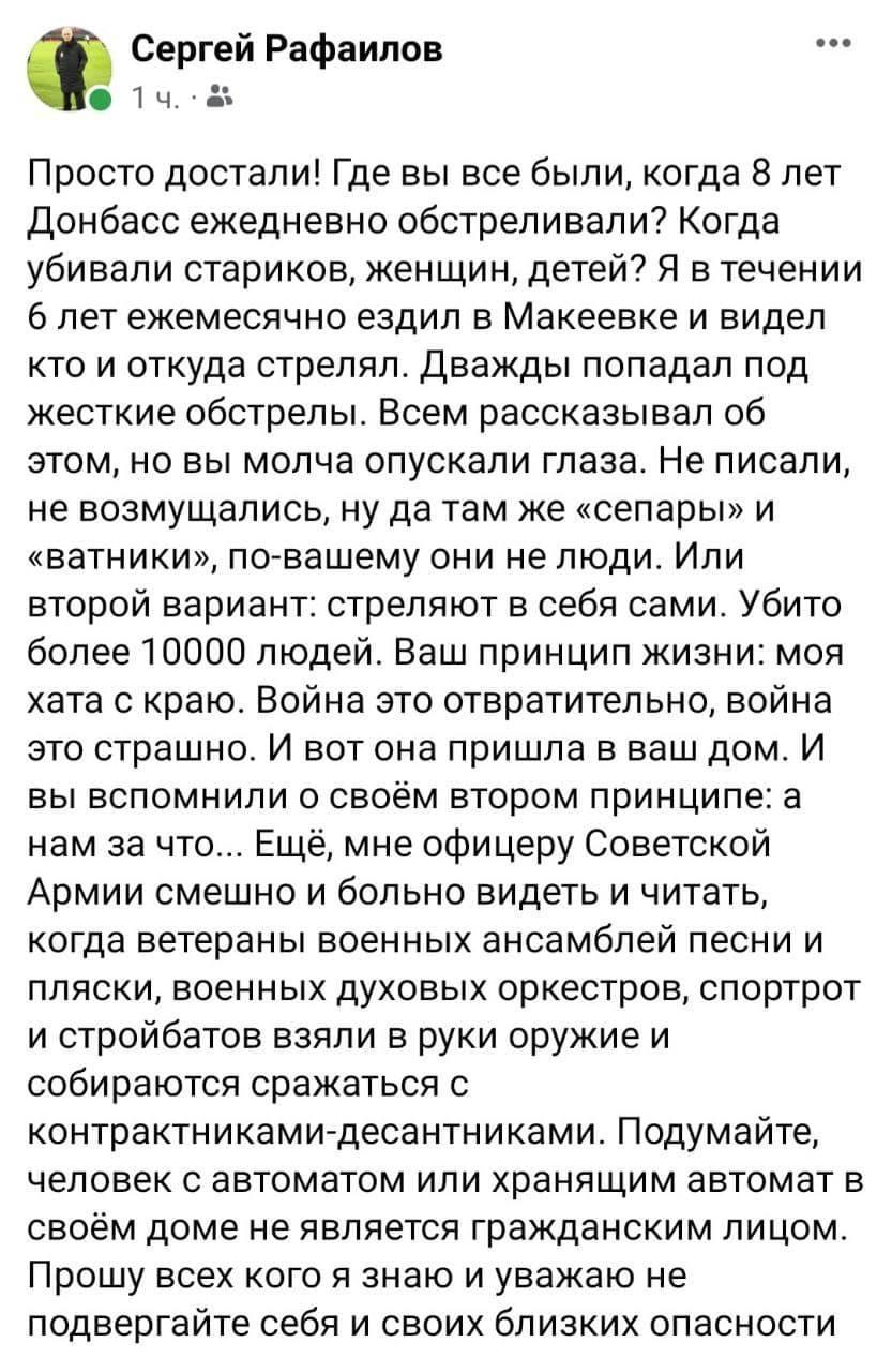 "Просто дістали! Де ви були всі ці вісім років, коли обстрілювали Донбас, вбиваючи дітей, жинок та стариків? Я шість років їздів до Макіївки та бачив, хто куди стріляє. Двічі я був під жорсткими обстрілами. Всім про це розповідали, але всі опускали очі. Звичайно, там же "сєпари" та "ватніки", а не люди. Або другий варіант — вони сами по собі стріляли. Вбито близько десяти тисяч людей. Ваш принцип життя: моя хата з краю (чия саме — питання, прим.ред.).