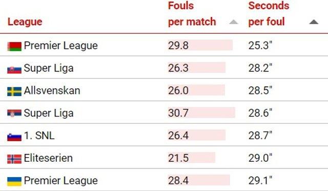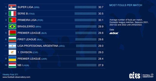 Лідирує у цьому списку сербська Суперліга – 30,7 фолів за одну гру, а за нею йдуть італійська Серія Б (30,5) та португальська ліга (30,1), в якій виступає українець Роман Яремчук.
