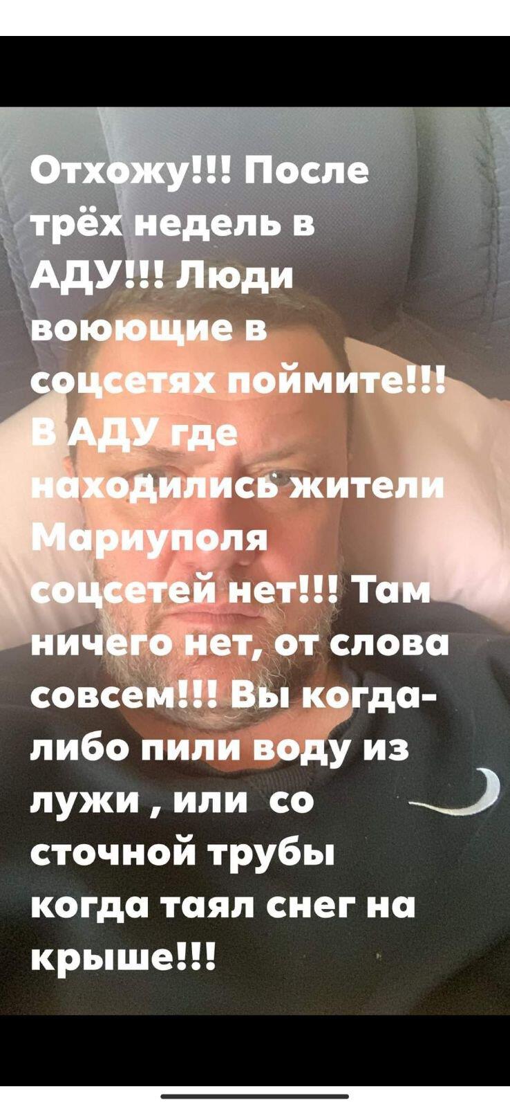 "Відходжу після 3 тижнів пекла. Люди, що воюють у соцмережах, зрозумійте – у пеклі, де живуть жителі Маріуполя, соцмереж немає. Там нічого нема, від слова зовсім.