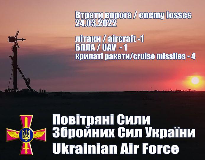 24 березня російські окупанти зменшили авіаційну активність у повітряному просторі України, натомість нарощують присутність безпілотних літальних апаратів оперативно-тактичного рівня та інших, для ведення повітряної розвідки. Один БпЛА оперативно-тактичного рівня нині уражено зенітними ракетами. Крім того, зенітні ракетні війська Повітряних Сил знищили один винищувач-бомбардувальник Су-34 на Харківщині та чотири крилаті ракети.