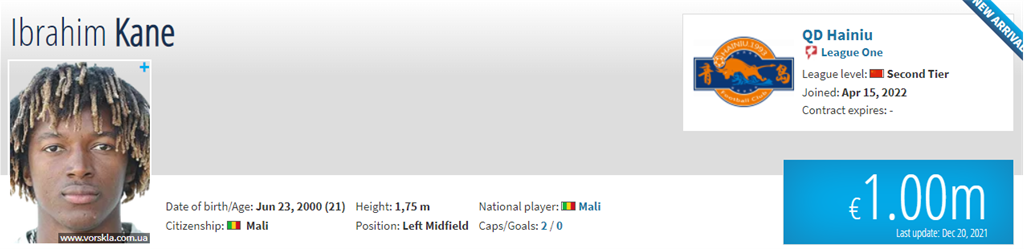 Захисник полтавської Ворскли Ібрагім Кане став гравцем китайського Циндяо Хайню. Про це повідомляє Transfermarkt.