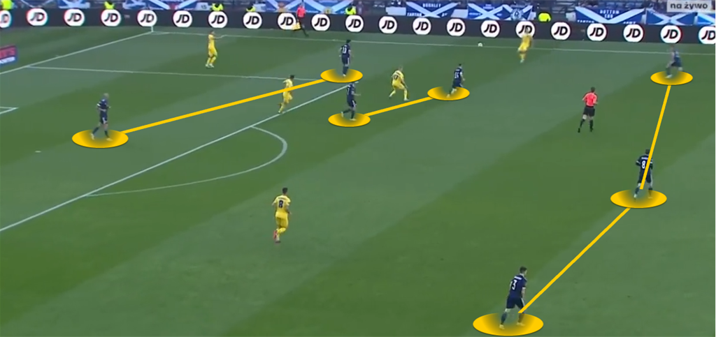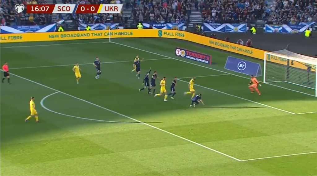 В розборі збірної Шотландії ми акцентували увагу на тому, що перехід з атаки в оборону – слабка сторона шотландців. Висока лінія захисту і невидатні швидкісні якості центральних захисників дозволили не найшвидшому гравцю української збірної Андрію Ярмоленку вибігти з-за спин своїх опонентів, обробити м’яч і перекинути його через голкіпера.